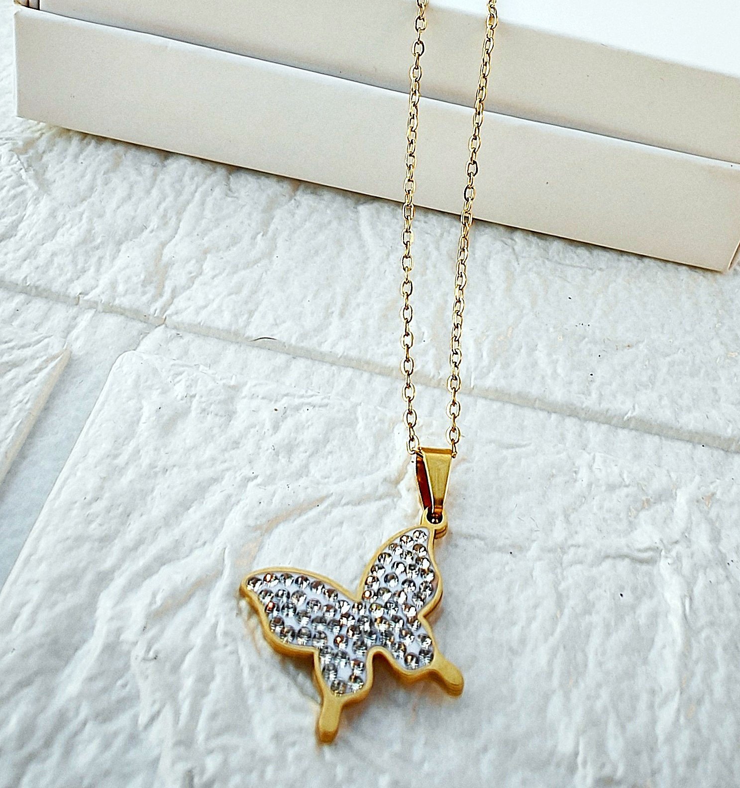 Apresentamos o encantador Colar Borboleta com Strass Aço Inoxidável, um acessório elegante que combina sofisticação e versatilidade. Este colar é a escolha perfeita para aqueles que desejam adicionar um toque de glamour ao seu visual diário ou àquela ocasião especial. O design delicado da borboleta destaca-se com a luminosidade dos strass, criando um efeito visual que certamente chamará a atenção.